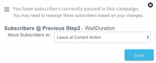 To prevent this issue, when prompted to handle the contacts in the Wait action, instead of selecting Leave at Current Action, select the Wait action you updated, and then click SAVE.