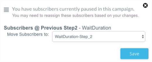 When you deactivate and then edit a campaign that has already been running, you may encounter contacts waiting to move through the campaign. After you make changes to the campaign and save, you will receive a popup notification: