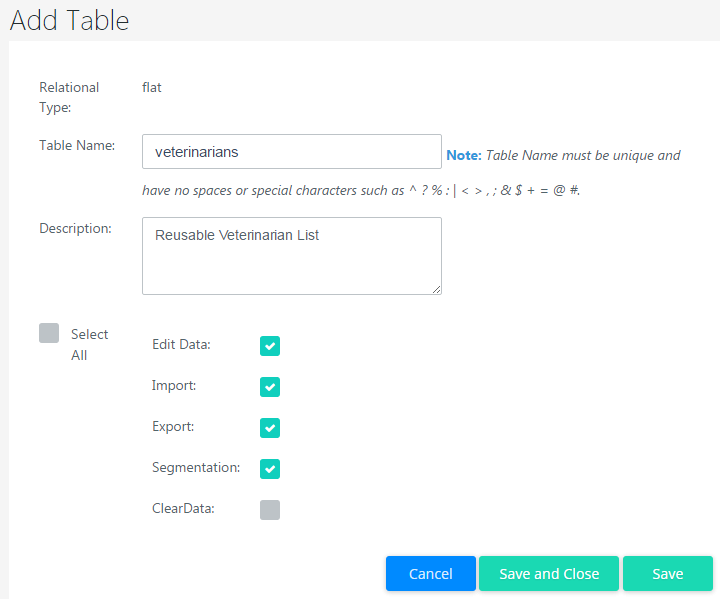 Click SAVE to save the new table and display the Edit Table page. Click SAVE AND CLOSE to save the table and then return to the Relational Tables list. Click CANCEL to close the page without creating the new table.
