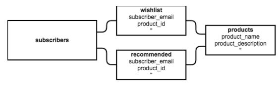 The third option gets into more complex design, using four tables: contacts, wishlist, recommended, and products.