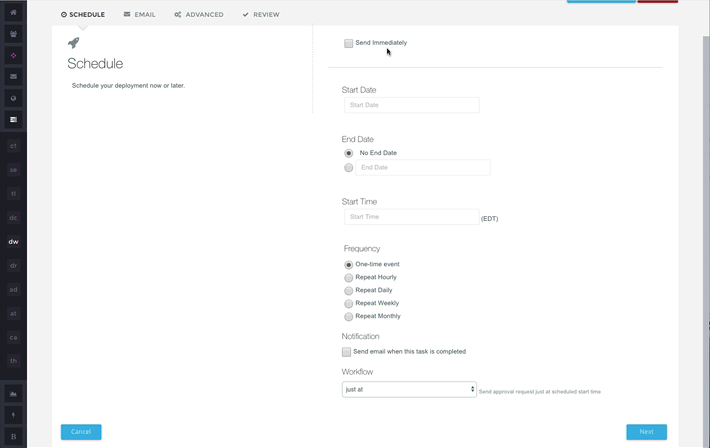 Recently we have made improvements to how email campaigns are deployed through the platform. To access the new tool, select Deploy Wizard from the Tasks heading in the navigation menu