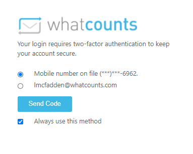 - Select where to send the code: Mobile, which displays the last four digits of the Mobile number on file, or Email, which displays the email address used in the Login attempt. If you wish to use the same method every time, select Always use this method.