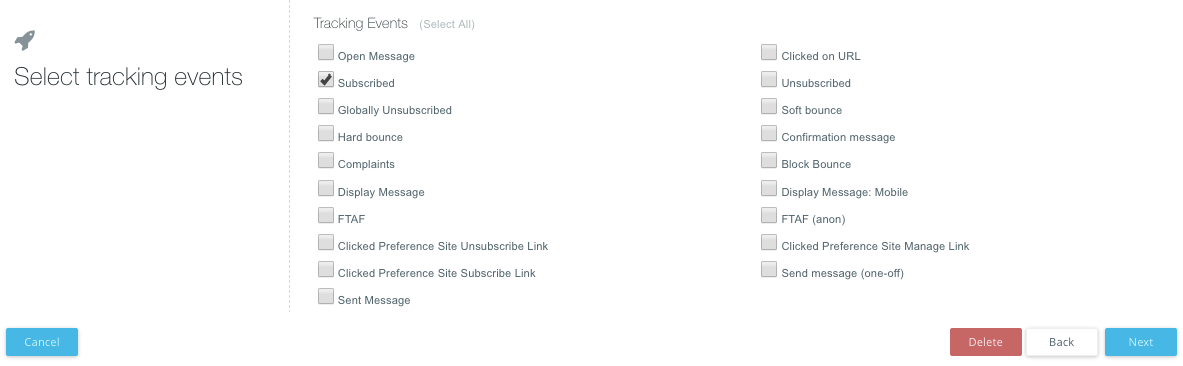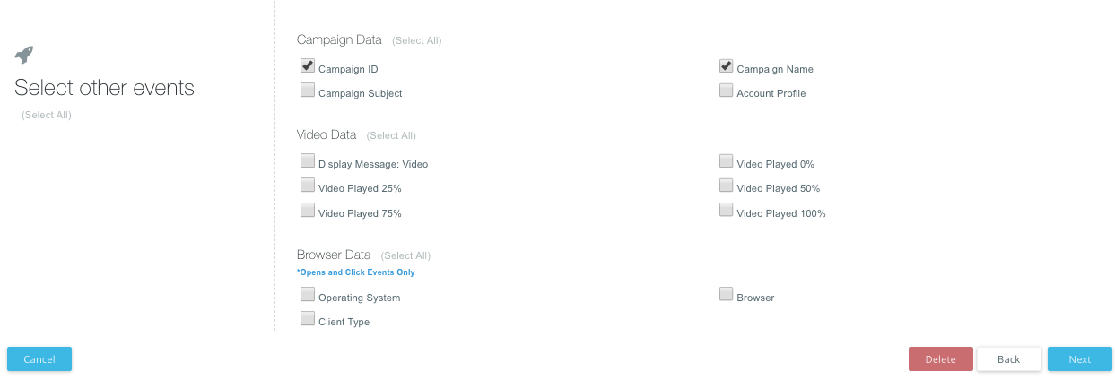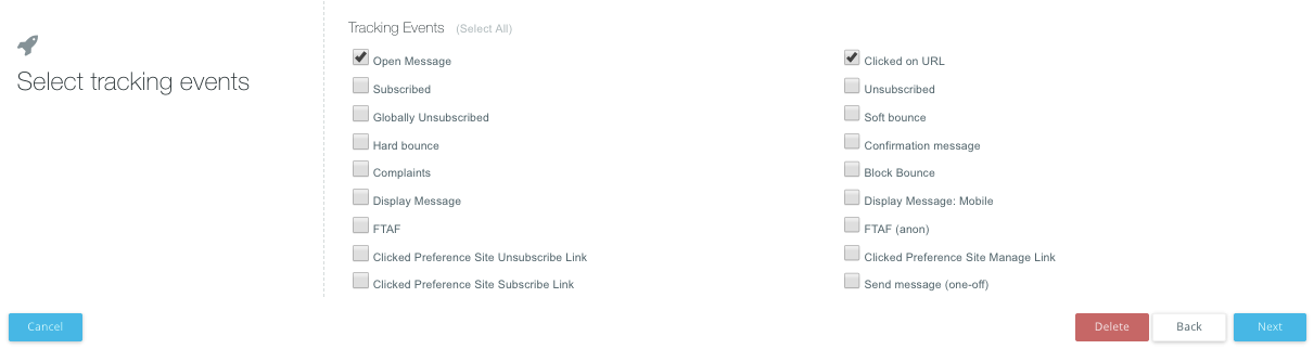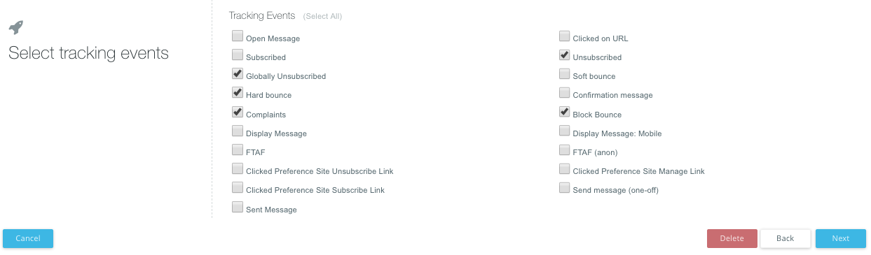 On the next screen we will select what Events we want to have included in the Event Wizard export, as noted above we are mostly concerned with the events that correspond to email engagement and delivery.