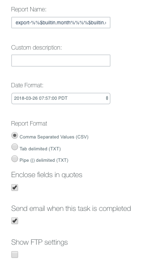 The final screen is setting the export details, such as file name, date and field formatting, as well as FTP options. Note that we are using the same dynamic date tags available in templates to be able to dynamically name our exported data with a time-stamped filename such as export-%%$builtin.year%%%%$builtin.month_padded%%%%$builtin.day_padded%%.