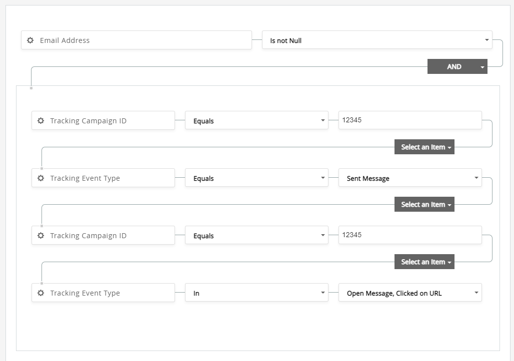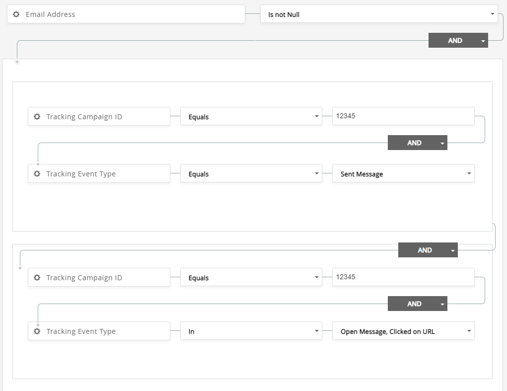 - Change the operator between each pair of Tracking Campaign ID and Tracking Event Type conditions to AND so they will be evaluated together.