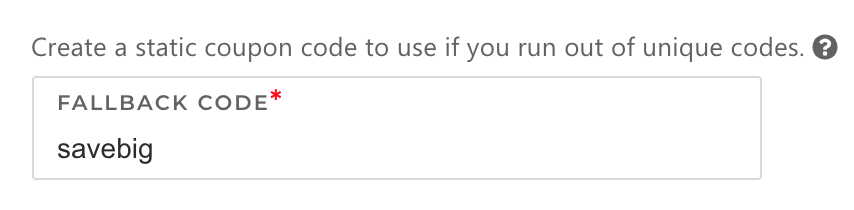 Next, enter or edit your “fallback” code for your batch (e.g. “savebig”). This static code will be used in place of a unique code should your batch run out of codes at any point. With this fallback in place, recipients will still receive a code, even if your batch runs out.
