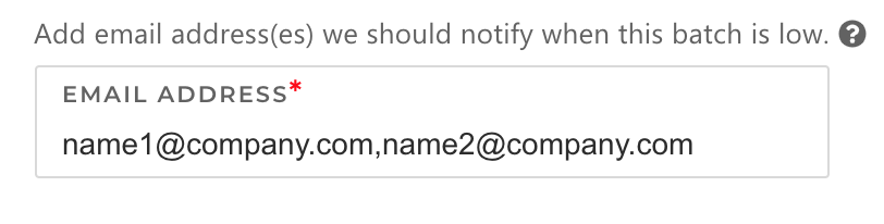 Finally, enter or edit any email addresses you’d like us to notify when your batch is running low. You can add multiple addresses by separating them with a space, comma or semicolon.