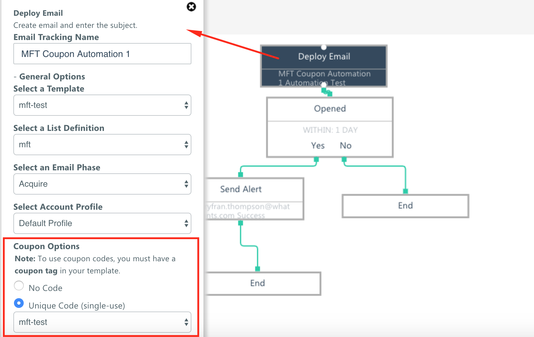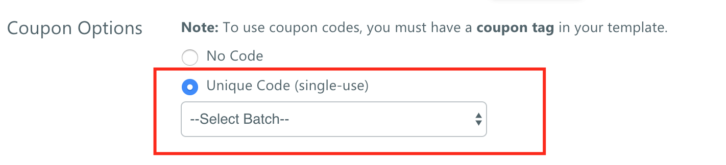 In the Email Tab, under Coupon Options, select “Unique Code,” and then select the batch you would like to use.