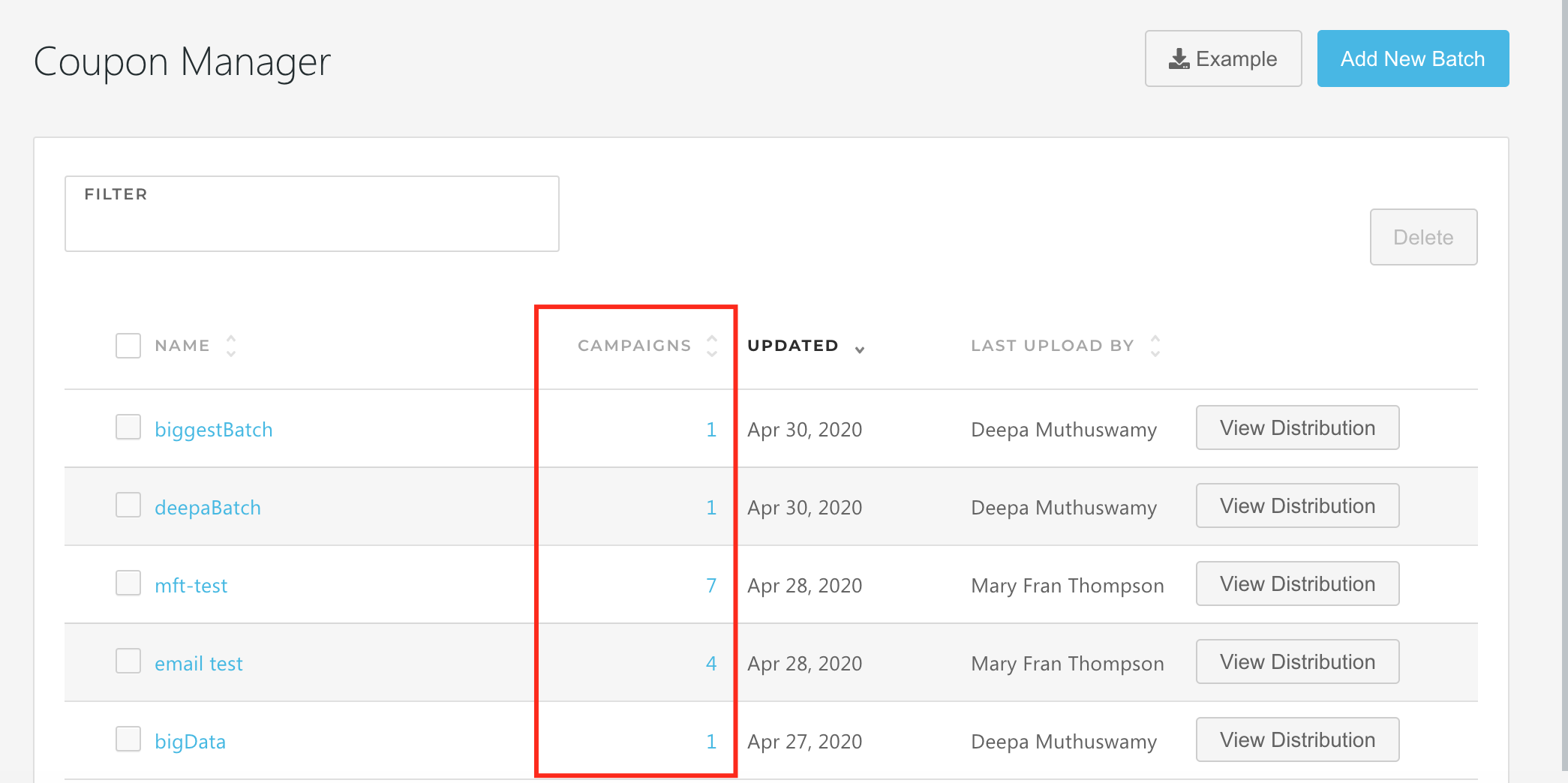 Once an email or automation using a batch has been deployed, you’ll be able to see that campaign reflected in the “Campaigns” column on the Coupon Manager page.