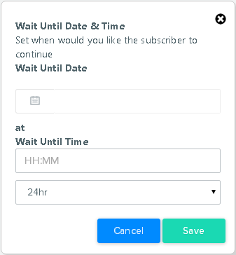 The Wait Until action allows you to pause Contacts in the workflow until a certain Date and Time has passed. For example, you may wish to send a Black Friday preview message, then wait until Midnight on the day after Thanksgiving to send a follow up.