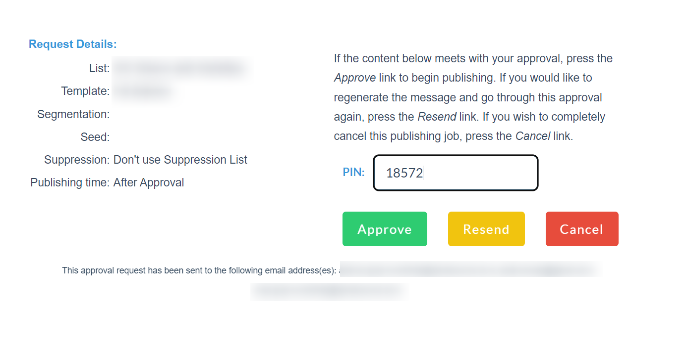 To enable Protected Workflow Approval, contact the WhatCounts Support Team. Once enabled, each workflow message will requires a user to enter a PIN before selecting a workflow action. There is no option to enable this feature per list.